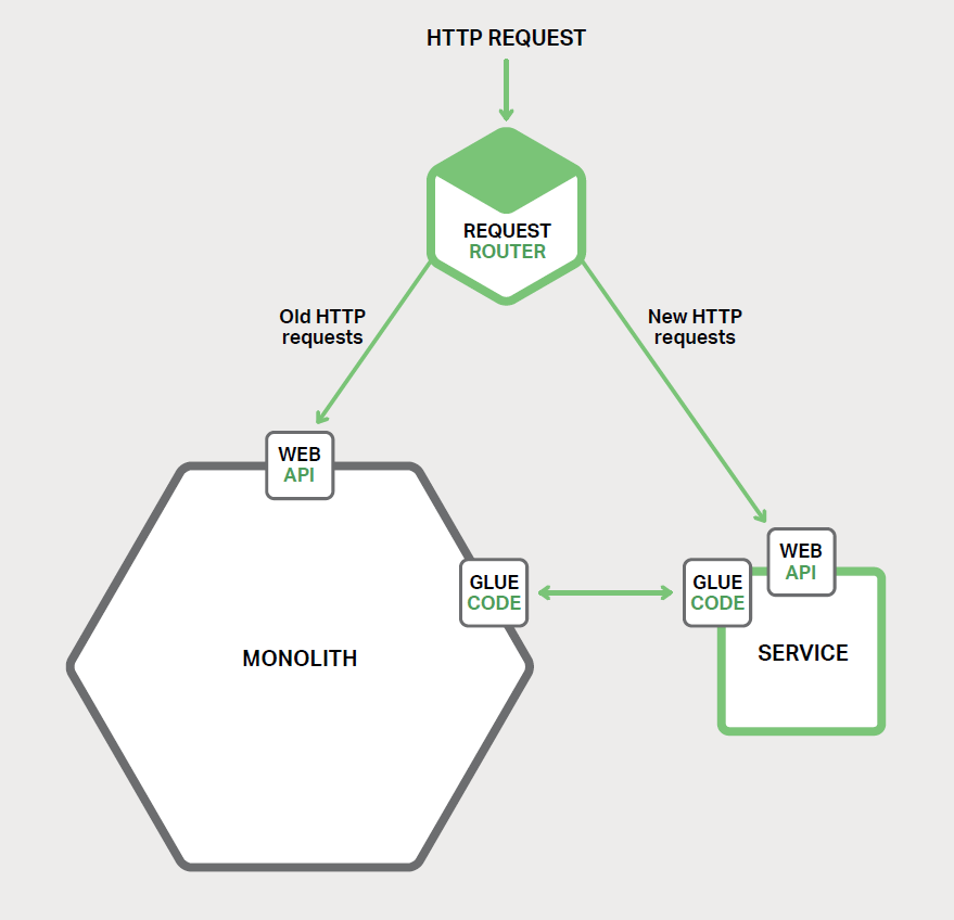 另一个组件是粘合代码,它将微服务与单体应用集成。服务很少孤立存在,通常需要访问单体应用的数据。位于单体应用、微服务或两者中间的粘合代码负责数据集成。该微服务使用粘合代码来读取和写入单体应用数据。
